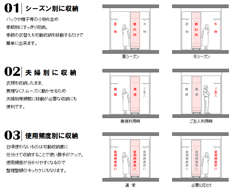 長谷工コーポレーションは、中村ハウゼックスと共同で、ウォークインクロゼットの内部にキャスター付の可動収納ユニットを設置することで季節別・家族別・使用頻度別等の分類が可能になる新しいタイプの収納システム『ムーブインクロゼット』を開発しました(特許出願中、商標登録申請中)。これにより従来のウォークインクロゼットに比べ機能性・収納力が向上します。 第一号採用物件は分譲マンション「プレイズ堺 光明池」(所在地:大阪府堺市、総戸数:242戸)となります。ムーブインクロゼットはお客様の声を反映させた長谷工の住まい提案商品シリーズのU's‐Style ※1に新商品としてラインアップし、今後、当社が設計・施工する分譲マンションへ導入促進を図ってまいります。 ※1 U's‐Style(ユーズスタイル)は、お客さまのあったらいいなの声をかたちにした長谷工のオリジナル仕様の暮らしアイテム です。本当に愛着の持てる住まいを目指し、暮らしの中で「あったらいいな」「こうすればもっと使いやすい」といったお客さまの声をふまえて、既製の商品や新たに開発した商品を組み合わせて、新しいマンションライフを提案しています。 【開発背景】 近年、収納は住まいにおける関心の高い要素のひとつとなっています。長谷工グループでは、マンションのモデルルーム来訪者から入居者に至るまで、収納に対する様々なニーズを調査・分析し、検討を行っています。今回はそのニーズ分析の中から、限られたスペースでいかにより多くの収納ができるか、暮らし方や家族構成まで配慮した、実用的で使い勝手のよい収納空間を実現しました。 【特 徴】 1)季節別や家族別、使用頻度別など用途に合わせて機能的な収納が可能 2)空間を有効利用することで従来のウォークインクロゼットよりも収納率がアップ