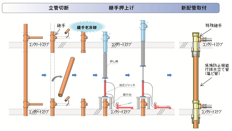 ・延焼防止機能付排水立て管(塩ビ管)に更新、継手に排水能力の高い特殊継手を設置