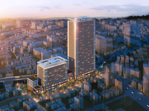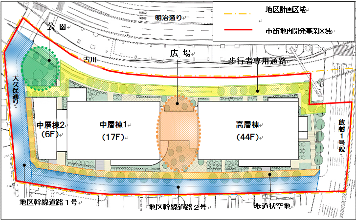 敷地東側に最高高さ約156mの高層棟(地上44階建て・地下2階予定)を配置し、広場を挟んだ西側に中層棟1(地上17階建て・地下2階予定)と中層棟2(地上6階建て・地下1階予定)を設けます。