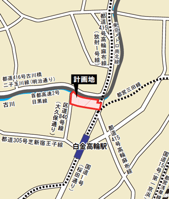 本施行地区は、幹線道路である放射1号線(幅員40m)、大久保通り(特別区道第840号線)と古川に面し、地下鉄白金高輪駅の近傍に位置した約1.7haの区域であり、戸建住宅や共同住宅を中心に、工場・事務所・店舗・病院等の多種多様な土地利用がなされています。