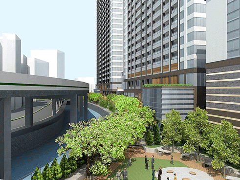 当地区の北側に流れる古川沿いに緑あふれる歩行者通路・公園・公共空地を整備し、古川へのアクセス性を高めるとともに、古川の水辺のモデルとなるゆとりと潤いのある水辺空間を創出します。