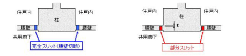 柱の耐震性能を向上させるには、地震時の柱の変形性能を高めるのが効果的です。そこで、当社がこれまで培ってきたマンションの設計・施工技術に、ロンビックジャパンが保有する耐震スリット施工の技術を融合し、開放廊下側から腰壁及びたれ壁付きの柱に高精度の部分スリットを設置することで、居住しながら柱の変形性能を高める耐震補強工法を2011年に開発しました。 従来は、腰壁及びたれ壁付き柱にのみ適用が可能でしたが、そで壁付き柱も多いため、適用範囲を拡大しました。