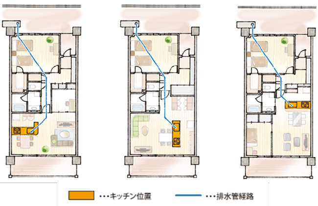 排水管に勾配の必要がなく、管も小口径となることで、床下空間をこれまでより低く設計できることに加え、サイホンカにより排水立て管からの距離の制約が減ります。この技術をキッチン系統等の排水に採用することでキッチンの配置の自由度が大幅に向上するため、入居後の間取り変更の自由度も向上し、より入居者のライフスタイルの変化に合わせたリニューアルが実現できます。