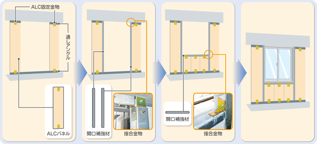 (※2)取り付け金物は、通しアングル(鋼材)、開口補強材(鋼材)、接合金物(鋼材)、ALC固定金物(鋼材)で構成されており、従来は金物同士を溶接で固定していました。
