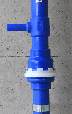 ポリエチレン管プレハブユニット端部の「ゴム輪受口と挿し口の接合」を抜け出し防止リングで固定。「Eロックカバーのスライド」のツータッチで接合可能。主にピット内配管や給水立て管の接合部で使用します。