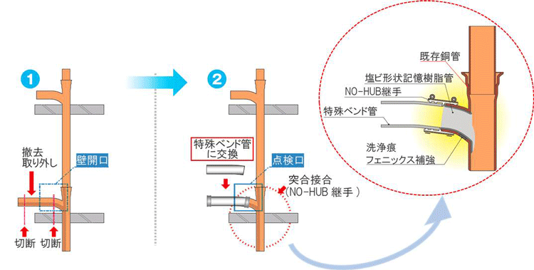 立管と横引管との合流部の壁面に点検口を設けて作業します。コンクリートのハツリ工事がなく、既設配管の切断・研磨時に音が発生する程度で工事ができます。