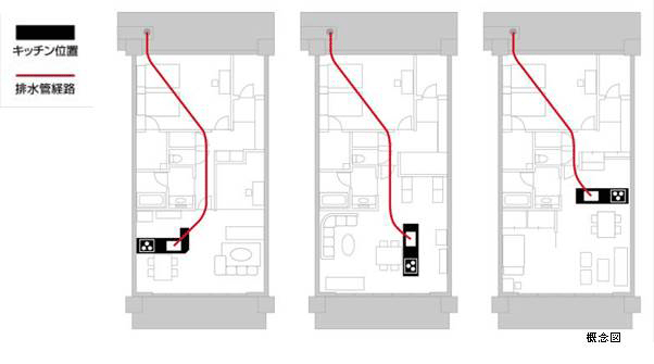 (※2)「スマートサイホン」とは、サイホンカ(水が落ちることで発生する引く力)を利用する新しい排水システム、サイホン排水システムのための商品です。当該商品を採用することで、マンションの床下空間を従来より低く設計でき、台所や浴室等の水回りの配置の自由度が向上します。