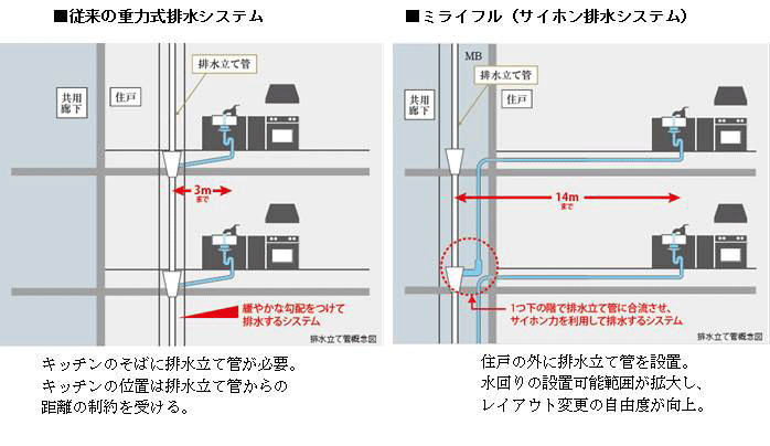 水が落ちることにより発生する吸引力を利用した「サイホン排水システム」をキッチンに導入したことで、キッチンのレイアウト変更が可能になり、(1)多様なライフスタイルに合わせ、キッチンを大胆に配置したプラン(2)子供が独立した後の夫婦二人の豊かなシルバーライフや、介護が必要になった時のバリアフリー対応など、ライフステージの変化に合わせて間取りを変える「可変性」が実現しました。人々の暮らしや家族の在り方がますます多様化するこれからの時代に、その多様性を受け止める「住まい」を提供してまいります。
