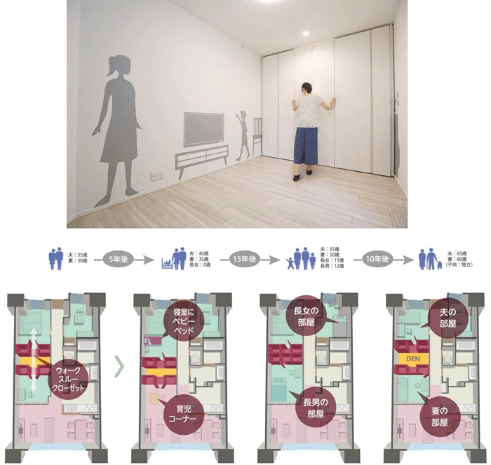 家族の成長や使い勝手に合わせて可動収納ユニット両側の居室とその間の空間の広さを自由に変更