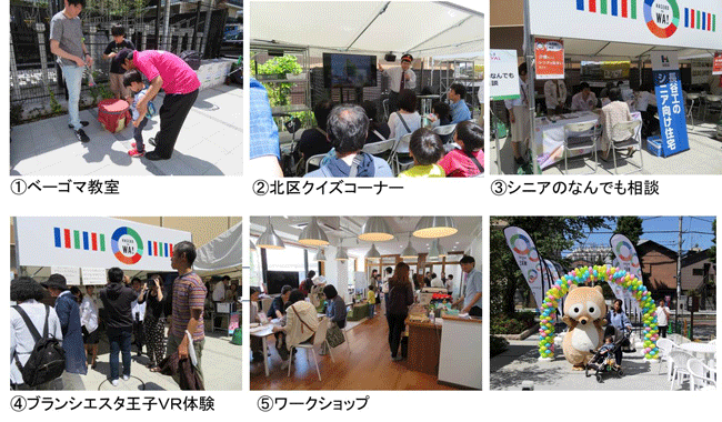 縁日やベーゴマ教室、万華鏡・お手玉作り体験、ピザ作り体験などのワークショップを実施し、また、元ボクシングWBC世界フライ級チャンピオンの内藤大助氏や、長谷工のテレビCMをネタにするお笑い芸人のテゴネハンバーグをゲストに迎え、北区にまつわるクイズ大会などで大いに盛り上がりました。
