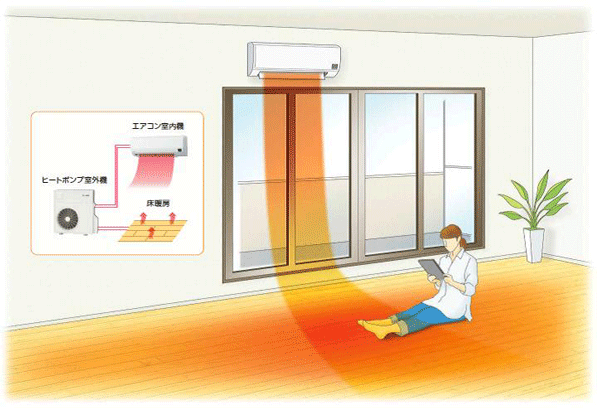 本商品は、ヒートポンプを内蔵した室外ユニットにエアコンと床暖房を組み合わせたもので、夏はエアコン冷房、冬は床暖房とエアコン暖房の併用が可能です。