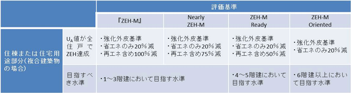 2014年4月に閣議決定された「エネルギー基本計画」において、「住宅については、2020年までに標準的な 新築住宅で、2030年までに新築住宅の平均でZEH(※1)(ゼッチ/ネット・ゼロ・エネルギーハウス)の実現を 目指す」という目標が設定されています。また、2018年度から集合住宅向けZEH支援事業がスタートし、要件を満たした集合住宅に対して一定の補助金が交付される予定です。集合住宅のZEH評価として、「ZEH-M」「Nearly ZEH-M」「ZEH-M Ready」及び、太陽光発電が不要な「ZEH-M Oriented」の4つが挙げられています。