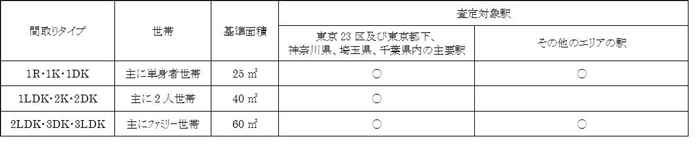 本賃料査定は、当社管理物件他、当社が信頼できると判断した情報に基づく過去1年間(2017/1~12)の賃貸成約データ及び直近3ヶ月の募集データをもとに、当社独自の分析調査により算出したものです。間取りタイプを、下記の3つに分類し、それぞれのタイプに基準面積を設定したうえで、駅別に査定を行っております。