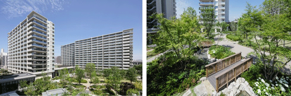 JR塚口駅(尼崎市)前、大正10年創業の製菓工場跡地(約8.5ha)において再開発を実施。ロータリーを駅前に新設し、駅ビル、商業施設も誘致し、そこへ1,271戸のマンション・戸建てを開発。駅前でありながら全体の25%を緑地化し、公園を設け、利便性と緑豊かな暮らしの両立を実現。駅前は「工場」から、緑豊かな「街」へと転生した。マンション住人も戸建て住人も利用可能な共用部を設け、住人のコミュニティ形成を促進。さらに商業施設も参加する「街づくり協議会」の立ち上げにより、地域一体で「街づくり」が可能に。地域通貨とエネルギーマネジメントを連携した全国初の取り組みも実施。「ずっと暮らしたくなる街」を具現化した。