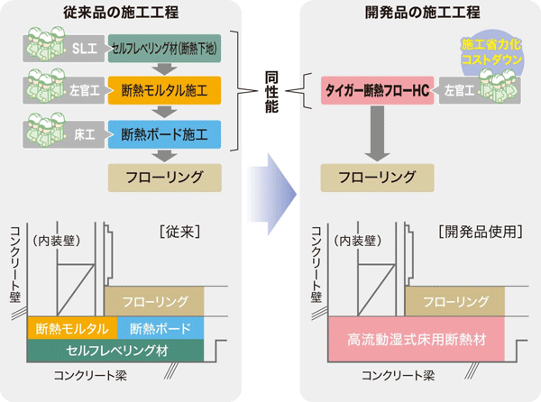 「タイガー断熱フローHC」は、熱橋(※1)部の断熱補強と結露を防止する床用の断熱補強材で、セルフレベリング機能を有しています。断熱性能については、第三者試験によって、建築物省エネ基準に適合することを確認いたしました。施工性においても、従来の湿式および乾式の断熱材に比べて、単一工種での施工による省力化とコストダウンを図ることができます。