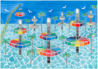 世界人口が増加する未来では広い海にマンションを建てます。棟の真ん中の軸を通って上下に移動できます。軸に差し込むだけで部屋を簡単に増やせます。透き通ったきれいな海とヤシの木に囲まれて気持ちいいです。