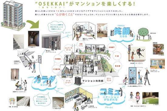 マンションの日常を振り返ってみました。数々のシーンの中、共用部のトイレやゴミ置場等は機能が優先で少々殺風景な空間だ。「住まい作りは暮らしをデザインする事でもある」と云われます。ちょっとおせっかい(気遣い)したデザインは自然と笑顔や会話が生まれ、日々の暮らしの中で数値化されにくい様々な日常のシーンを創造し+αのOSEKKAIアイデアで人の心を動かす共用部を実現しました。