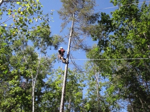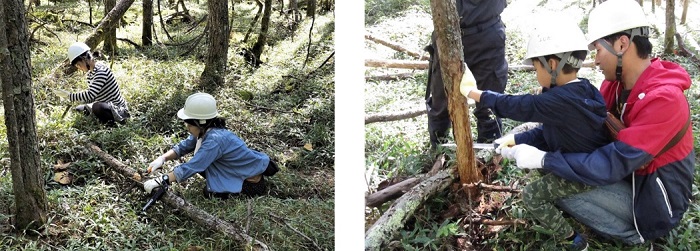 今回はグループ社員とその家族82名が参加しました。地元協力業者による迫力のある大木伐採のデモンストレーションを見学した後、七ヶ耕地財産区をはじめ長野県林務部、長野県諏訪地域振興局などの協力のもと、森林内の自然散策で生物多様性の保全について学び、午後から小木の伐採や倒木片づけ等の森林整備作業を行いました。