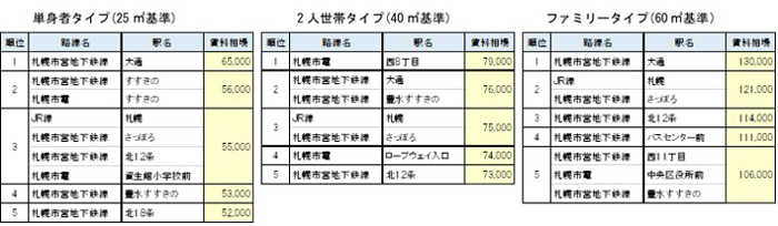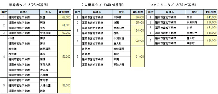 なお、今回の調査結果を基に作成した間取りタイプ別賃料相場ランキングを見ると、各エリアの1位は以下の通りとなり、賃料水準もエリアにより違いがあることが分かりました。