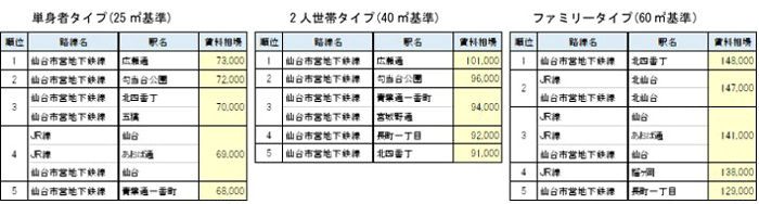 ・仙台市 S:「広瀬通」駅(73,000円) D:「広瀬通」駅(101,000円) F:「北四番丁」駅(148,000円)