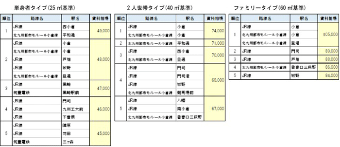 ・北九州市 S:「西小倉」「平和通」駅(49,000円) D:「小倉」駅(74,000円) F:「小倉」「旦過」駅(105,000円)
