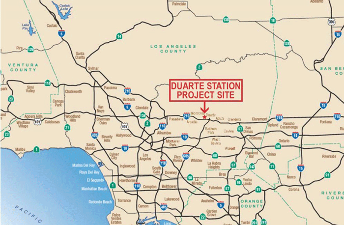 Downtown Los Angelesまで車で30分、周辺都市のPasadenaまで同15分の好立地。LA近郊の主要都市及び住宅地を結ぶGold Lineが通るDuarte/City of Hope駅に隣接する賃貸住宅開発案件。近接地には南加州において最先端ガン治療の病院兼研究施設として著名なCity of Hopeがあり、同施設の拡張計画もあるなど雇用拡大が見込まれる地域。