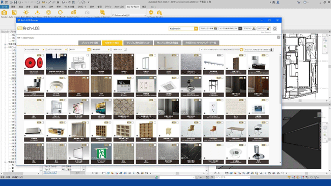 「Arch-LOG」には、一般的な建築部材、建材メーカーが作成しているオブジェクトや各素材のカタログデータだけでなく、衛生陶器や厨房機器、医療機器などのデータも同一のプラットフォームに格納されています。「Arch-LOG」を活用することで、多種多様なオブジェクトの検索やBIMに取り込む手間、素材選択からサンプル依頼、色彩などを確認するためのマテリアルボードの作成に至るまで省力化を図ることができます。また、高精細なレンダリング機能(※3)を活用することで、関係者間の意思決定の迅速化を図ることができます。
