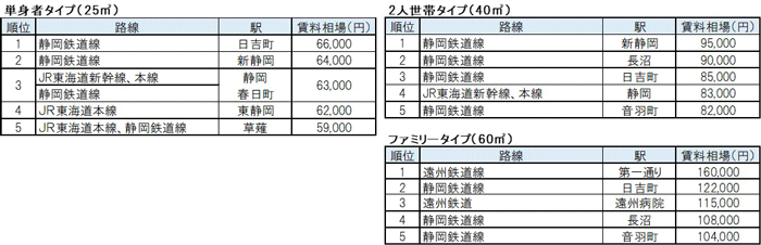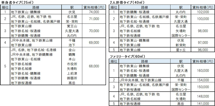 今回の賃料相場を間取りタイプ別にランキングにした結果、愛知県内では単身者タイプの1位「伏見」駅(74,000円)、2位「名古屋」駅・「栄」駅(71,000円:同率)、3位「覚王山」駅・「久屋大通」駅・「丸の内」駅(70,000円:同率)となり、全ての駅が名古屋市内の地下鉄沿線駅となりました。2人世帯タイプ、ファミリータイプについても同様の傾向となり、地下鉄を中心とした商圏の強さが目立つ結果となりました。また、静岡県内では単身者タイプの1位「日吉町」駅(66,000円)、2位「新静岡」駅(64,000円)、3位「静岡」駅・「春日町」駅(63,000円:同率)となり、JR「静岡」駅の北部で静岡鉄道沿線駅の賃料水準が高い結果となりました。
