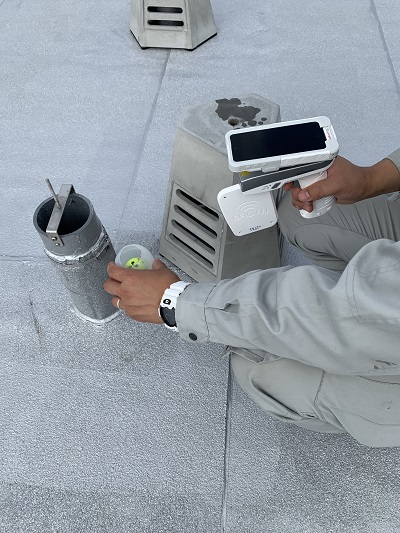(※2)各住戸を貫通する排水管の通球試験。屋上の通気口から試験ボールを投入後に通水し、屋外の排水桝で回収