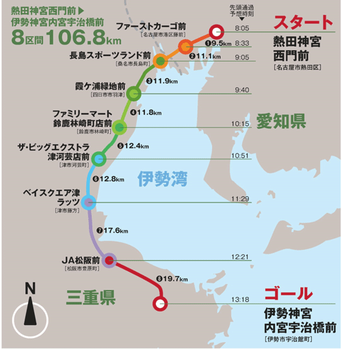 コ ー ス:熱田神宮西門前(愛知県名古屋市) → 伊勢神宮内宮宇治橋前(三重県伊勢市) 8区間 計106.8km