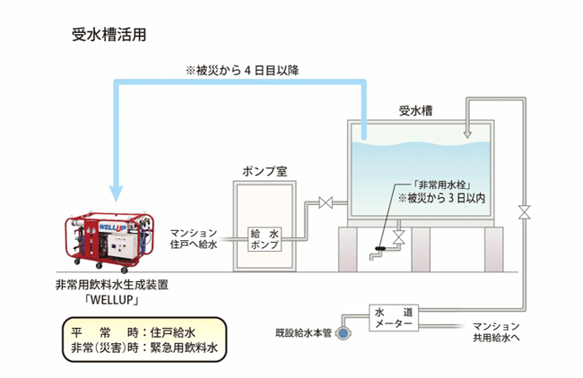 スマート・ウォーター・タンクに加えて、受水槽が設置される案件については、受水槽に非常用水栓を設置し、受水槽内の水も利用できるようにします。受水槽の水は、水道水の塩素殺菌効果の有効性から被災から4日目以降の利用については、非常用飲料水生成装置「WELLUP」を活用して飲料水とします。