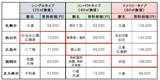 今回の調査結果を基に算出した間取りタイプ別賃料相場ランキングを見ると、単身者向けのシングルタイプでは仙台市「勾当台公園」「広瀬通」駅、2人世帯向けのコンパクトタイプでは仙台市「青葉通一番町」、広島市「銀山町」駅、ファミリータイプでは福岡市「赤坂」駅がそれぞれ1位になりました。ファミリータイプのランキング1位となった「赤坂」駅については、駅近・築浅の分譲タワーマンションの賃貸流通が多いことが要因と考えられます。また、他のエリアにおいても上位にランクインした駅をみると、商業・官庁・オフィスが集積している市の中心エリアに集中していることが窺えました。