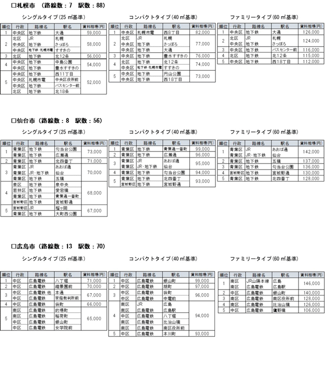 長谷工ライブネットは、地方中核都市の沿線・駅別の賃料相場を分析し、「中核都市版賃貸マンション賃料相場マップ2021年」(以下、「中核都市版賃料相場マップ」)を完成させました。 このたび完成した「中核都市版賃料相場マップ」は、札幌市、仙台市、広島市、福岡市、北九州市の5つの地方中核都市において、当社が管理している約10,500戸の賃貸マンション成約データと、当社が信頼できると判断した情報に基づく2020年1~12月の賃貸募集データ約12.4万件等を基に、各都市における賃料相場を当社独自の分析調査によりまとめたものです。(対象:45沿線、延べ353駅)
