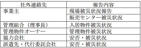 ・物件被災状況報告...セコム非常呼集サービスを利用し、グループ全社員が自宅周辺の管理受託物件や施工中物件、高齢者向け住宅などの建物状況、周辺状況等を目視し報告