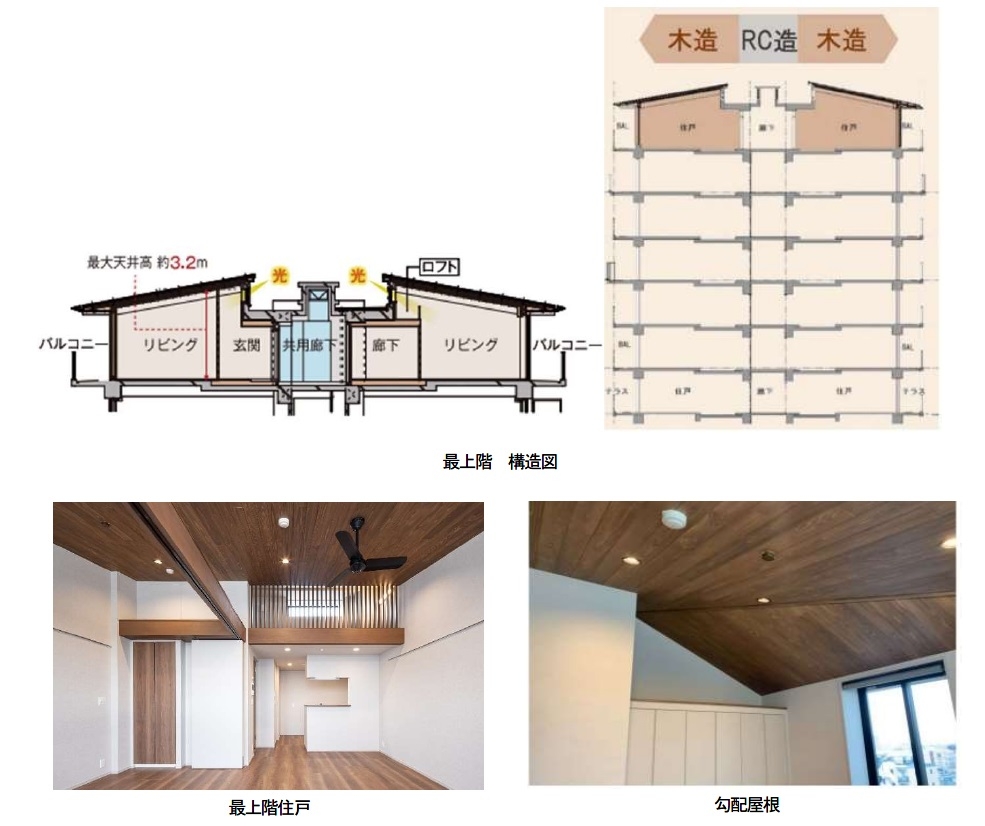 「ブランシエスタ浦安」の最上階は、RC造と木造のハイブリッド工法を採用しております。住戸内部には勾配屋根を採用したロフトを設置し、天井およびロフト格子にも木材を利用しております。