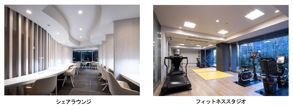 仕事や読書などができるシェアラウンジは、カウンタータイプとブースタイプの2種類。外観デザインを踏襲したゆるやかな曲線と、ゆとりある空間を演出しております。さらに、入居者専用のフィットネススタジオを設置しており、マンション内で気軽にトレーニングを楽しめます。
