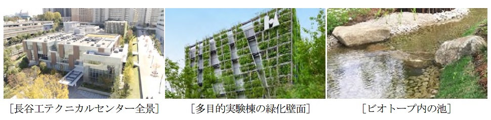 長谷工テクニカルセンターは、17,662㎡の敷地に4棟の施設を配置し、地上部分や建物の壁面部分・屋上部分などに約8,000㎡(敷地面積の約45%)の緑地を確保しています。また、敷地の中央部にはビオトープを設け、近隣の小川から採捕したアブラハヤやミナミメダカを池に放流しており、2018年3月の竣工以来、多くのいきものが確認できるなど、生物多様性の確保に寄与しています。