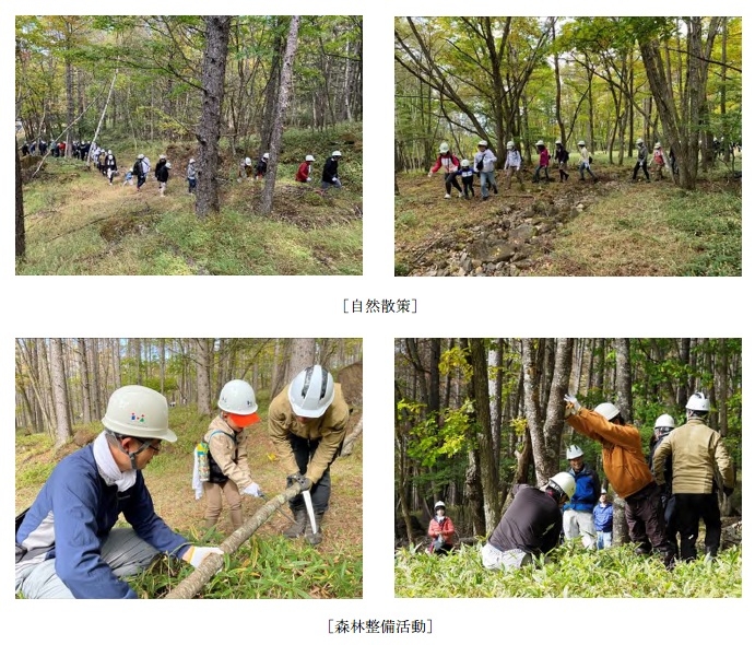 今回はグループ社員及びその家族78名が参加し、七ヶ耕地財産区の協力のもと、午前は森林内の自然散策で環境保全の重要性や生物多様性への配慮について学び、午後から小木の伐採や倒木片づけ等の森林整備活動を行いました。