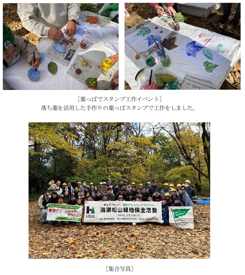 当日は、グループ社員およびその家族43名(うち子供4名)が参加し、東京都環境公社とNPO法人自然環境アカデミー、清瀬の自然を守る会の協力のもと、清瀬松山緑地保全地域(※2)において、落枝・落木整理、樹木除伐、草・笹刈り、木柵・ロープ交換などを行いました。また、子供連れの家族を対象に、落ち葉を活用した「葉っぱでスタンプ工作イベント」を実施しました。