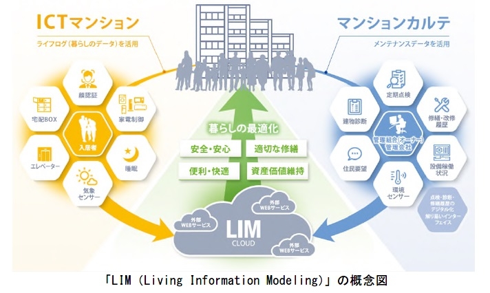長谷工では、「ICTマンション」に設置した認証設備や各種センサー等によって得られた住まう方のライフログや、「マンションカルテ」に登録された建物・設備のメンテナンスデータなどを活用し、暮らしを最適化する概念を「LIM(Living Information Modeling)」と呼んでいます。そして、それらのデータを収集・分析するプラットフォーム「LIM Cloud」を開発しています。※3