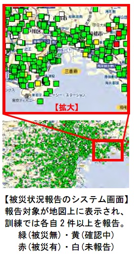 今回の訓練は、従来行っている社員・家族の安否報告およびグループ全社員による建設現場・管理物件等の被災状況報告に加え、レポートラインの強化や通信障害発生時の対応などを新たに実施し、震災による被害・影響を最小限に抑える上で重要となる初動対応力の更なる強化を図りました。また、事業主様への建設現場の被災状況報告や、マンションの管理組合理事長様から被災状況をご報告いただくなど、より実践的な訓練を行っています。