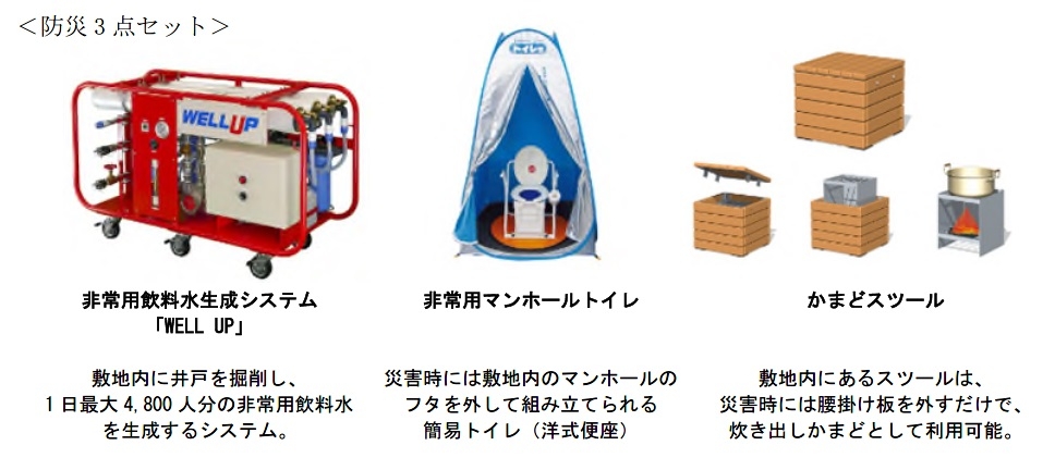 マンションそのものの耐震強度などの基本性能の確保だけでなく、災害が発生したあとの居住者の生活基盤を確保の観点から、万が一の時に備えた「防災3点セット」を2006年から大規模マンションの標準仕様として事業主に提案しています。