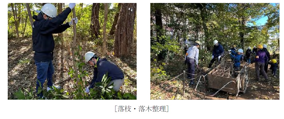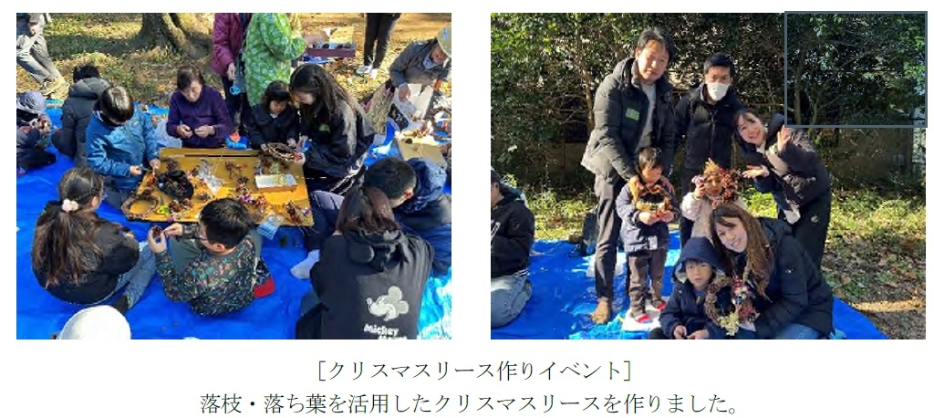当日は、グループ社員およびその家族40名(うち子供8名)が参加し、東京都環境公社とNPO法人自然環境アカデミー、清瀬の自然を守る会の協力のもと、清瀬松山緑地保全地域(※2)において、落枝・落木整理、樹木除伐、草刈りなどを行いました。また、子供連れの家族を対象に、落枝や落ち葉を活用した「クリスマスリース作りイベント」を実施しました。