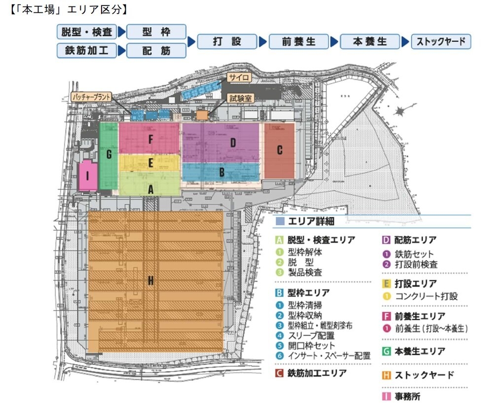 当社ではこれまで、マンション建設現場における生産性向上と品質安定化を目的に、板状マンションの外部階段などや、タワーマンション※2の柱・梁、内床・外床といった部材のPCa化に積極的に取り組んできました。今後は、新たに板状マンションの内床のPCa化を進める計画であり、最新鋭のPCa床板製造設備ラインを導入した本工場の新設によって、より安定的な部材供給が可能となります。本工場では年間4,000戸超の内床PCaを製造する予定としており、関東全域の当社マンション建設現場を対象に使用します。また、将来的には内床PCaの製造量を年間5,000戸超へと増産することを視野に入れています。