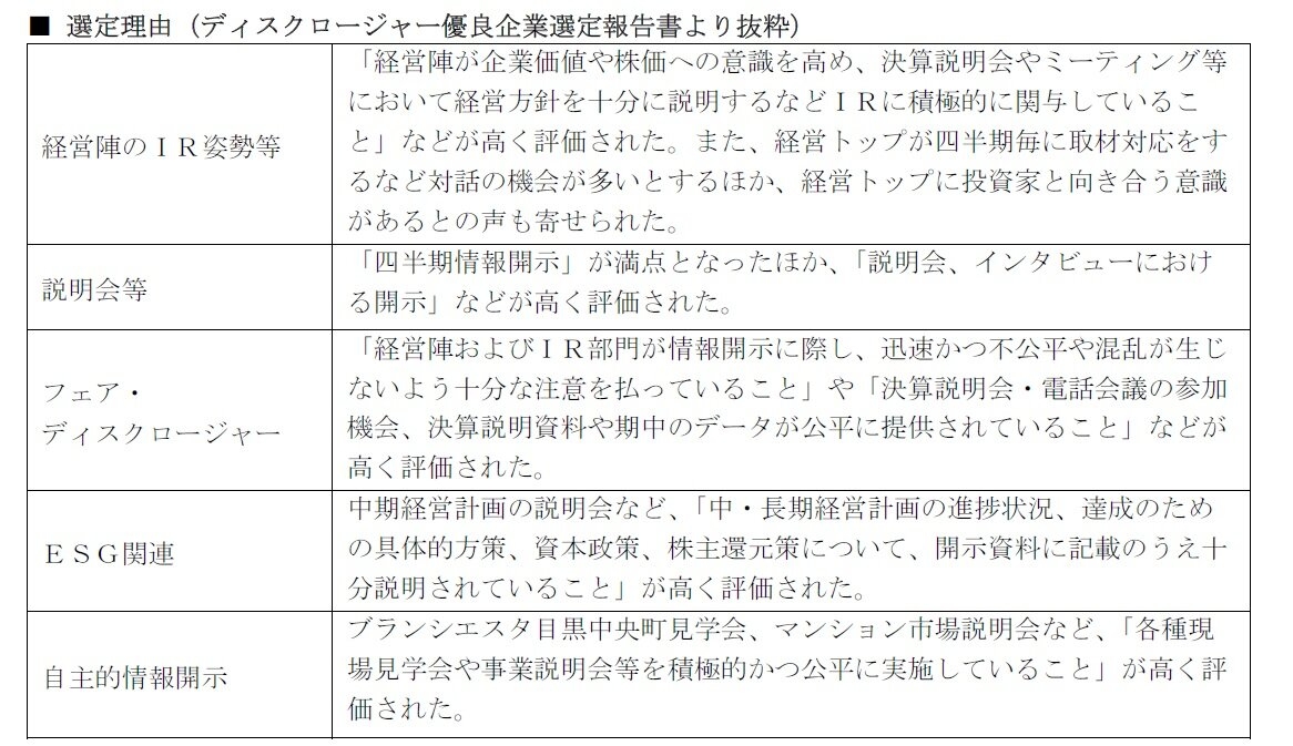 「証券アナリストによるディスクロージャー優良企業選定」は、企業の情報開示の質、量、タイミング等の優劣を判断するための客観的な評価基準を策定して開催する表彰制度で、1995年から毎年実施されています。当社は、17業種(対象企業284社)のうちの「建設・住宅・不動産部門」(対象企業18社)で、下記の理由により第1位を獲得しました。