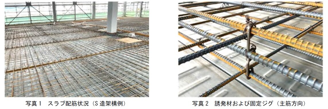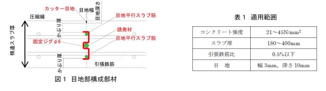 鉄筋コンクリート造スラブは、コンクリートの材料特性である乾燥収縮や周辺部材による拘束等の影響により、表面にひび割れが発生します。ひび割れの発生により、スラブの美観性に加え、建物使用性やコンクリートの耐久性に影響する可能性があり、これらを解消するため、スラブにひび割れ誘発目地を設ける方法が一般に行われています。この従来の目地を設ける方法は、スラブ表面に設けた誘発目地内に収縮ひび割れを発生させて、そのひび割れを適切に処置することにより、スラブの美観性や使用性、耐久性等を損なわないようにするものです。しかし、従来の目地を設ける方法は、スラブのコンクリート表面に適当な深さの目地を形成し、コンクリートを欠き込むだけのため、目地部は他のスラブ断面と比べて脆弱になると考えられています。そのため、構造スラブの設計に用いられるスラブ厚は、全スラブ厚から目地深さを減じた寸法としています。よって、実施工においては、スラブ表面に目地を設ける場合は、その目地深さ厚のコンクリートの増し打ちを行うのが一般的です。しかしながら、スラブ表面に目地を設けるだけでは断面欠損率が少なく、期待しているように目地内にひび割れが入らないのが実情です。