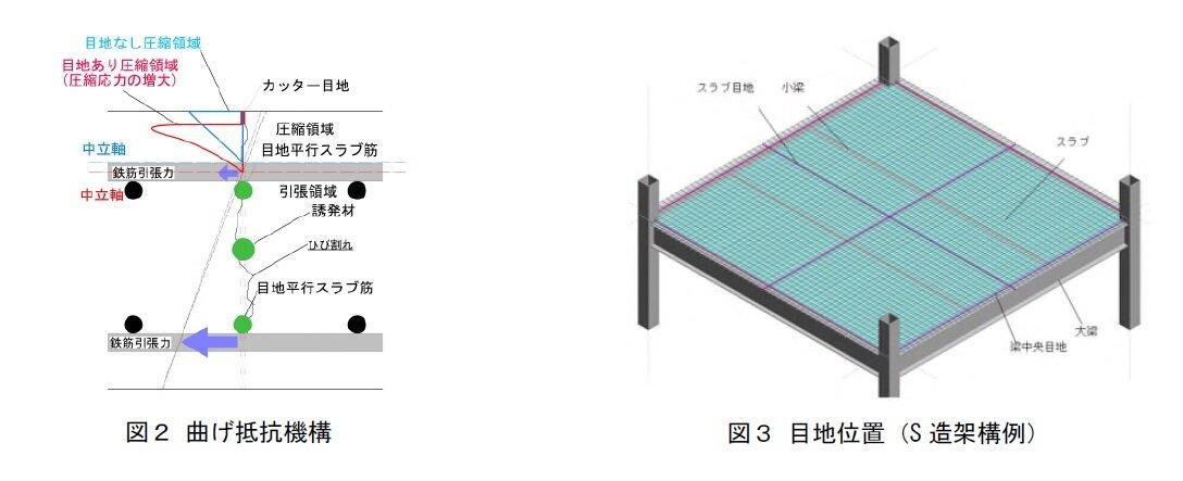 本工法は、鉄筋コンクリート造スラブの表面に、誘発目地として鉛直方向のカッター目地、ひび割れ誘発材(以下、誘発材)および目地平行スラブ筋を一直線上に配置して誘導効果を高めつつ、床スラブの耐力を目地部以外の床部分の全スラブ厚さを用いて、既往の設計式で評価できる工法です。今般の建築技術性能証明の取得により、本工法の実建物への適用が一層進むことが期待され、構造安全性を担保しながら高品質な建築物の構築、および増し打ちコンクリートの削減による環境負荷低減が見込まれます。
