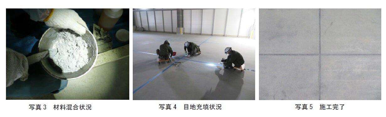・目地の角欠けを防止できる充填材として、圧縮強度や接着力、陥没抵抗性およびひび割れ分散性を有する PRS(Porous Resin Sand)の適用を推奨しています(写真3~5)。本材料は、(一財)日本建築総合試験所の建設材料技術性能証明「GBRC材料証明第22-01号」を取得しています。