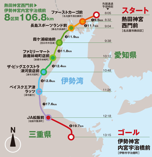 コ ー ス:熱田神宮西門前(愛知県名古屋市) → 伊勢神宮内宮宇治橋前(三重県伊勢市) 8区間 計106.8km