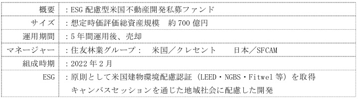 株式会社長谷工コーポレーション(本社:東京都港区、社長:池上 一夫)は、住友林業株式会社(本社:東京都千代田区、社長:光吉 敏郎)と100%子会社のCrescent Communities, LLC(本社:ノースカロライナ州シャーロット、CEO: Brian Natwick、以下、クレセント社)が2月28日付で組成した、ESG配慮型の米国不動産開発私募ファンドに出資することを決定しました。成長著しい米国サンベルトの有力な都市圏で、賃貸集合住宅4件(総戸数約1,000戸、資産規模USD580百万(約700億円))を開発し、5年間運用する計画で、全物件でLEED※1またはNGBS※2を取得するESG配慮型のファンドです。本件では、熊谷組(社長:櫻野 泰則、本社:東京都新宿区)や芙蓉総合リース(社長:辻田 泰徳、本社:東京都千代田区)等の複数の日本企業が参画し、これまで培ってきた多様な知見を活かしながら、開発プロジェクトを推進 します。
